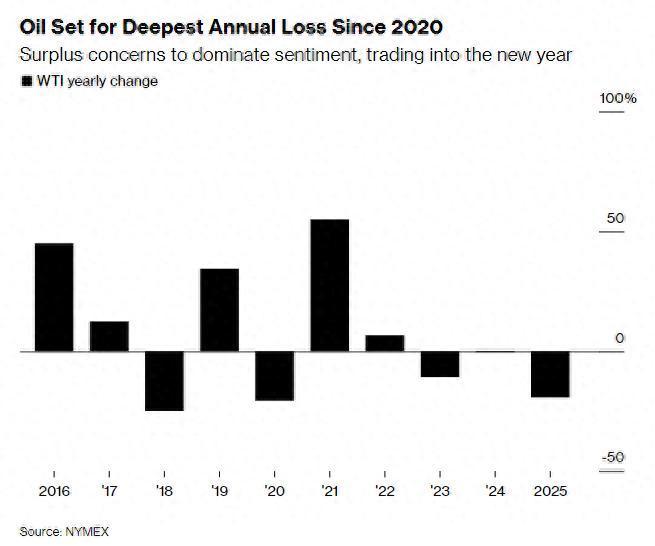 智通财经APP获悉,受市场对供应过剩的持续担忧拖累,国际油价正迈向2020年疫情爆发以来最严重的年度下跌。这一利空因素不仅主导当前市场情绪,还将对新一年的交易走势形成压制。