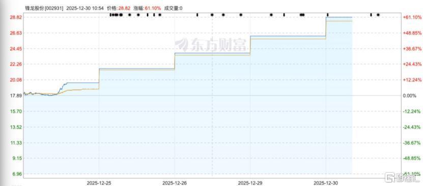 受此消息影响,12月25日锋龙股份复盘后即刻一字涨停,并接连实现四个交易日涨停(4连板),截至12月30日开盘报28.82元/股。