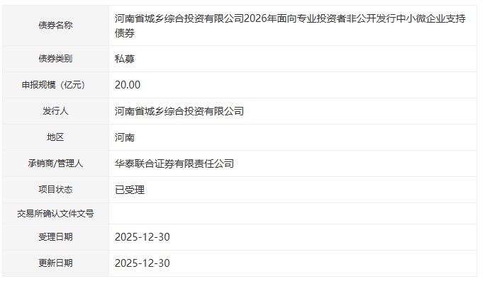 【大河财立方消息】12月31日消息,河南省城乡综合投资有限公司2026年面向专业投资者非公开发行中小微企业支持债券项目获深交所受理。